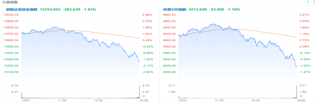 隔夜美股市场早盘企稳反弹,三大主要指数一度均上涨超过1.5%,一部分消化了因为前一天鲍威尔意外鹰派发言造成的冲击。但是临近尾盘,受美国发现首例Omicron确诊病例的消息影响,市场再度跳水,主要指数收盘跌幅均在1%以上,纳斯达克跌幅超过1.8%。与此同时,10年美债利率降至1.4%且以通胀预期为主,叠加美元继续走强,因此黄金并没有体现出避险效果。市场主要还是在担忧疫情及避险情绪加重。市场没有好的趋势和方向。
